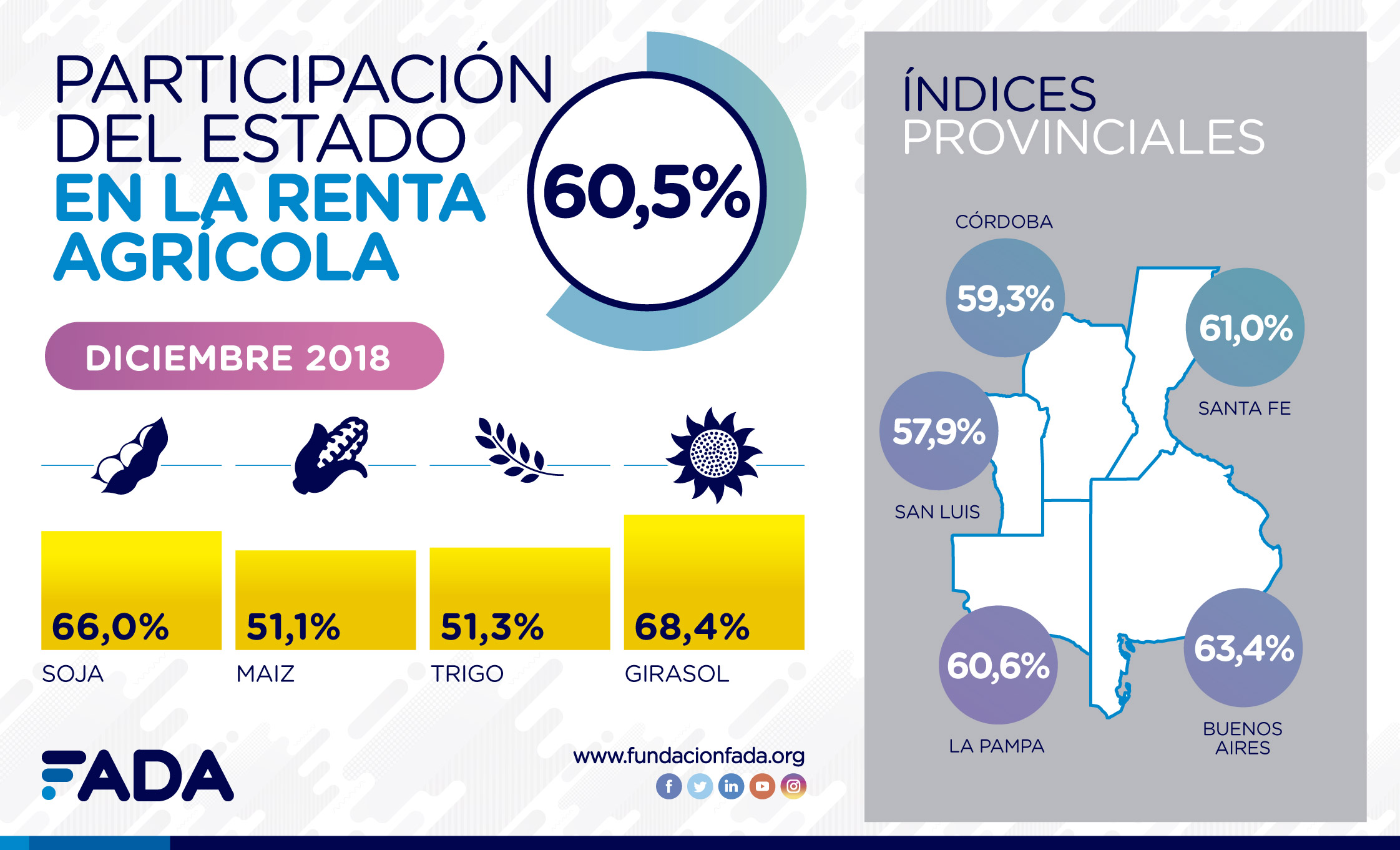 FADA (Fundación Agropecuaria para el Desarrollo de Argentina) publicó su informe trimestral sobre la participación del Estado en la renta agrícola. La medición de diciembre de 2018 marca una participación del 60,5% para el promedio ponderado de los cultivos de soja, maíz, trigo y girasol. Es decir, que de cada $100 de renta (ingresos menos costos) que genera una hectárea agrícola, $60,50 se lo llevan los distintos niveles de gobierno.