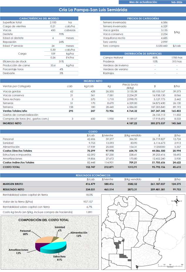 La ganadería de la provincia de San Luis continúa posicionándose dentro del mapa productivo nacional con un perfil claramente orientado a la cría bovina, según surge del Informe Trimestral N°57 de Resultados Económicos Ganaderos correspondiente a marzo de 2026.