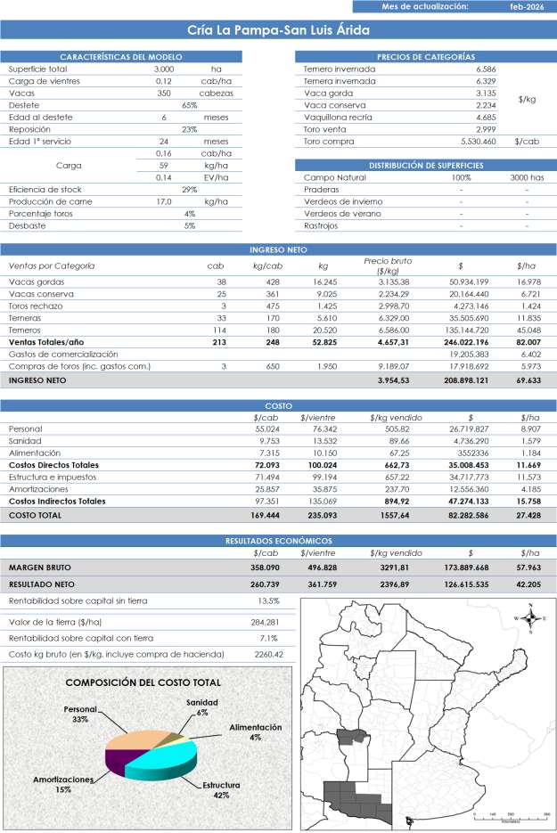 La modelización del informe señala que la provincia forma parte de sistemas representativos del país, donde se analizan variables técnicas y económicas para estimar resultados productivos típicos.