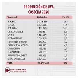 En 2020 la producción total en el país de la variedad Malbec fue de 3.721.290 quintales. A lo largo de los años la misma ha ido en aumento, a excepción del año 2016 en el cual hubo una merma general de las cosechas de uva.