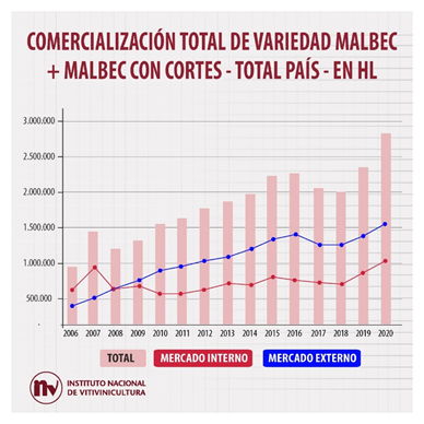 En el año 2020 se comercializaron 1.210.399 hl de vinos varietales elaborados con Malbec. El 88,7% corresponde a varietal puro y el 11,3% a cortes con otra variedad.