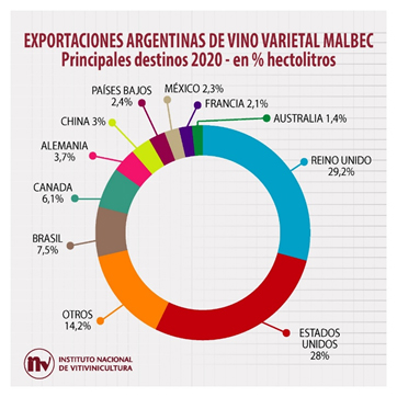El principal destino de los vinos varietales puros MALBEC en 2020 fue Reino Unido, seguido por Estados Unidos. Luego figuran Brasil, Canadá y Alemania. En tanto para el Malbec con cortes los principales destinatarios fueron: Reino Unido, Estados Unidos, Brasil, Colombia y Canadá.