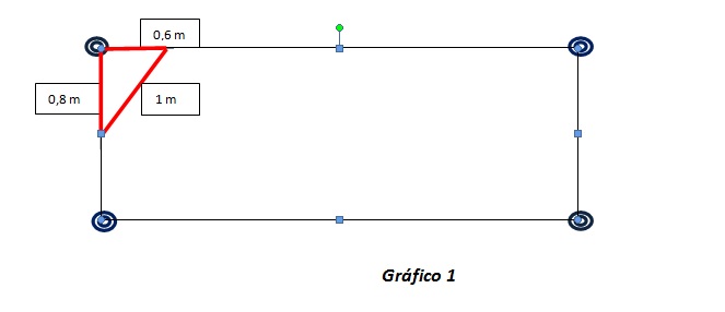 Colocamos los 4 esquineros de forma provisoria, conformando un rectángulo de 11,5 x 4 metros. Tensamos un hilo entre los mismos y sobre estos medimos 0,6 m y 0,8 m respectivamente como muestra la figura, abriendo o cerrando una de las líneas hasta que la unión de los mismos nos de un metro.