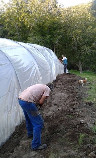 10: Abrimos zanja en ambos laterales del invernadero. Función: Tapado de nylon transparente-Fijación.- Podemos también envolver el extremo en madera que nos permita levantar los costados para ventilación.