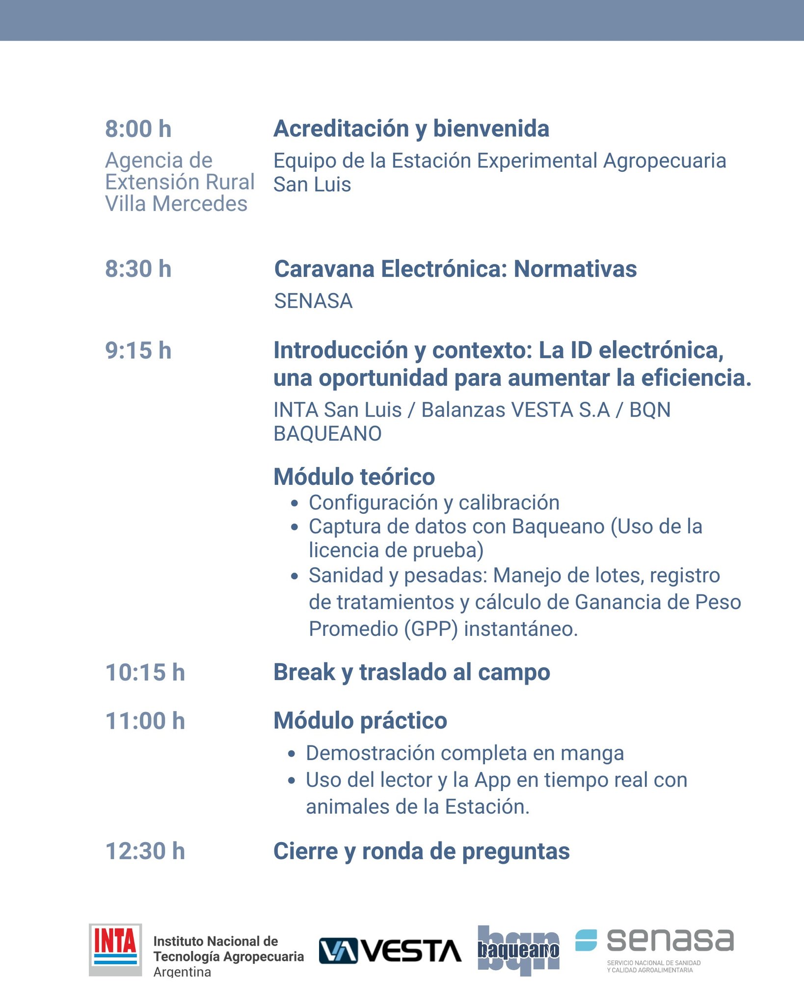 La capacitación comenzará a las 8, con la acreditación y la bienvenida a cargo del equipo del INTA San Luis. Minutos más tarde, a las 8:30, referentes de SENASA presentarán el módulo “Caravana Electrónica: Normativas”, donde repasarán los criterios oficiales y los requisitos para la correcta identificación del ganado a través de dispositivos electrónicos.