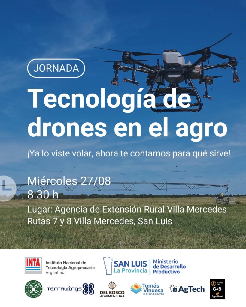 El próximo miércoles 27 de agosto a las 8:30 se realizará en la sede del INTA de Villa Mercedes una jornada dedicada a la “Tecnología de drones en el agro”, un encuentro destinado a productores, asesores técnicos, estudiantes e interesados en la innovación aplicada al sector agrícola.
