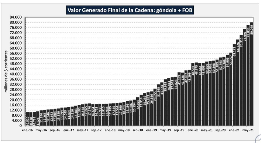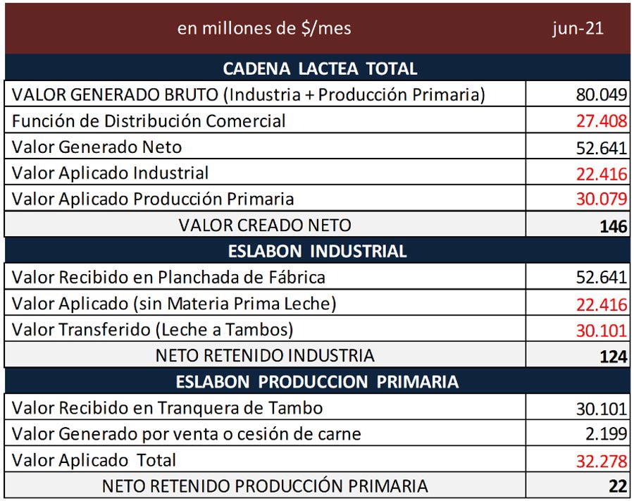 La facturación total de la cadena de valor lácteo fue en el mes de junio del 2021 de $ 80.049 millones es decir +2,6% con el mes anterior (+6,0% en promedio diario) y +59,9% en el anual, recordando que la inflación anual (IPC) fue del 50,2% y el tipo de cambio oficial BCRA se devaluó en un 37,0%.