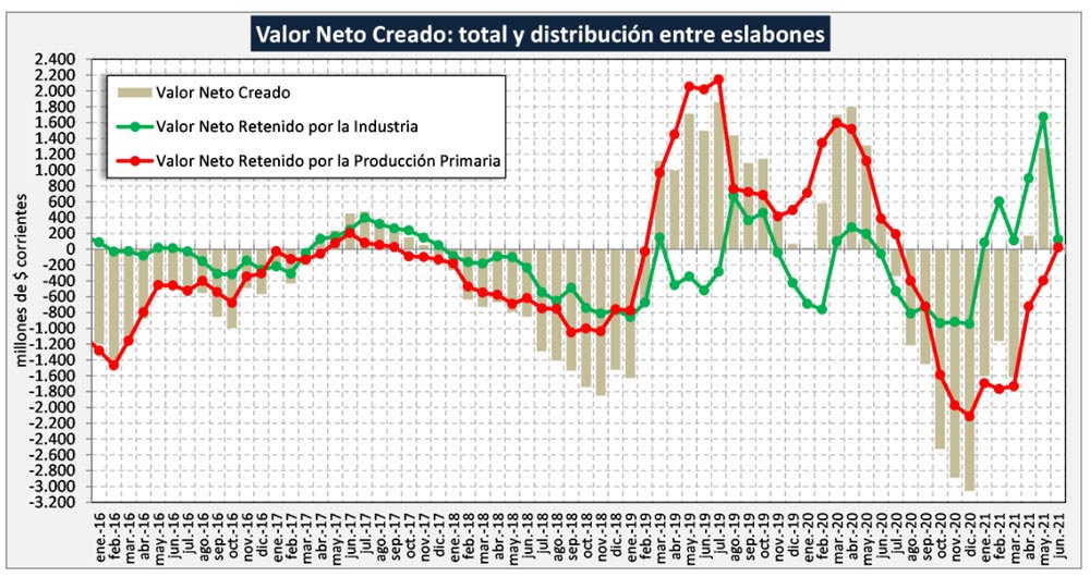 El Sector Primario venía de diecisiete meses en la zona de números positivos (mar19-jul20), pero los 10 meses posteriores (ago20-may21) fueron negativos y logra en junio del 2021 un mes con resultados levemente positivos de $ 22 millones. Como ya lo indicamos, más que un problema de precios (+72,7%) es un problema de suba extraordinaria de costos: 1) Suba internacional del precio de los granos (maíz y soja) que aumentan el costo de alimentación y alquileres y, 2) Cierre de exportaciones de carne, que afectan el recupero que generaba la venta de las vacas de rechazo.