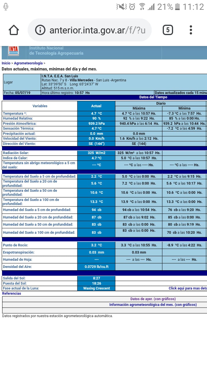 Las térmicas más bajas, además de en La Angelina, se registraron en Soven y Villa Reynolds con -8ºC y Villa Mercedes, Anchorena, El Trapiche y La Bajada con -7ºC.