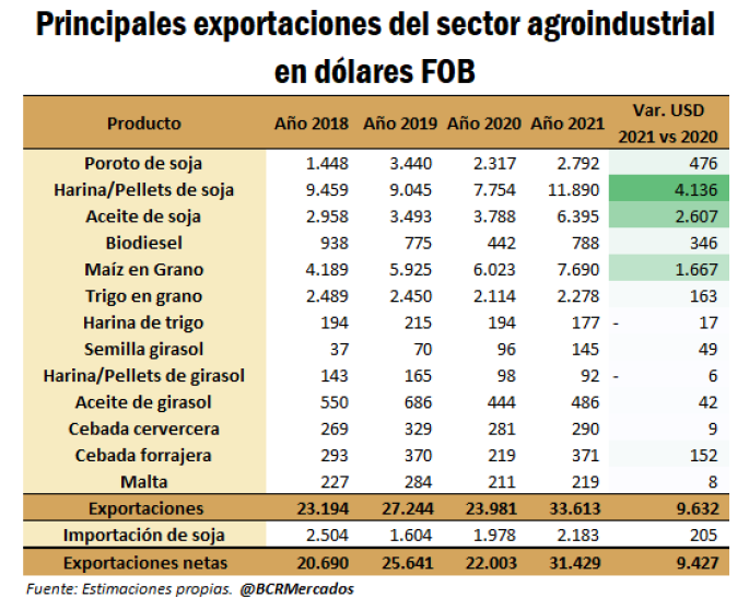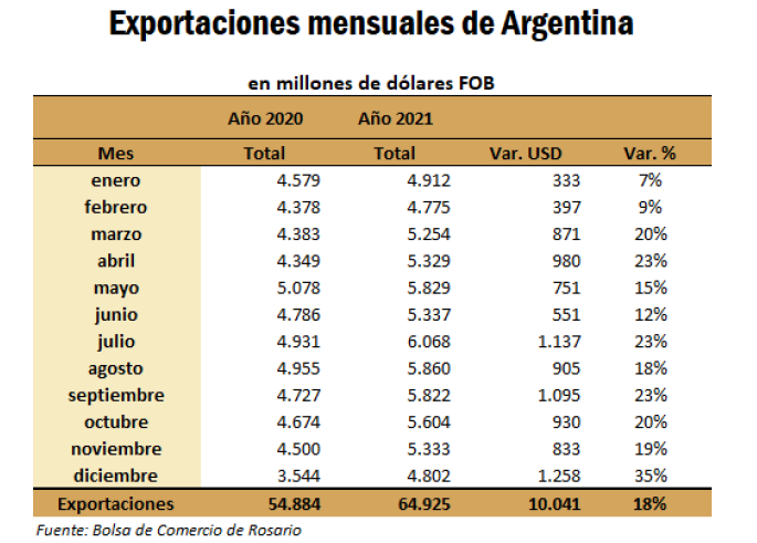 De acuerdo con el último Panorama de Mercado de la Bolsa de Comercio de Rosario, “para el año 2021 se proyectan exportaciones de Argentina por un total de 64.925 millones de dólares”. Esto representa un incremento de aproximadamente 10.000 millones de dólares respecto al año 2020 (una variación del 18 %).