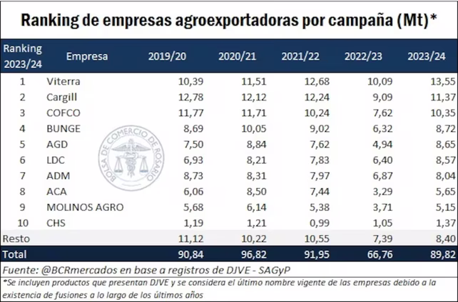 Viterra (compañía que recientemente se fusionó con Bunge) encabezó el ranking con 13,55 millones de toneladas registradas; fue la empresa con mayor participación en las exportaciones agroindustriales del ciclo. En segundo lugar se ubicó Cargill (multinacional de EEUU), con 11,37 millones de toneladas, seguida por Cofco (la empresa estatal China National Cereals, Oils and Foodstuffs Corporation), con 10,35 millones. “Estas tres compañías explican cerca del 39% del total anotado en exportaciones de los principales productos agroindustriales del ciclo 2023/24″, detalló el informe.