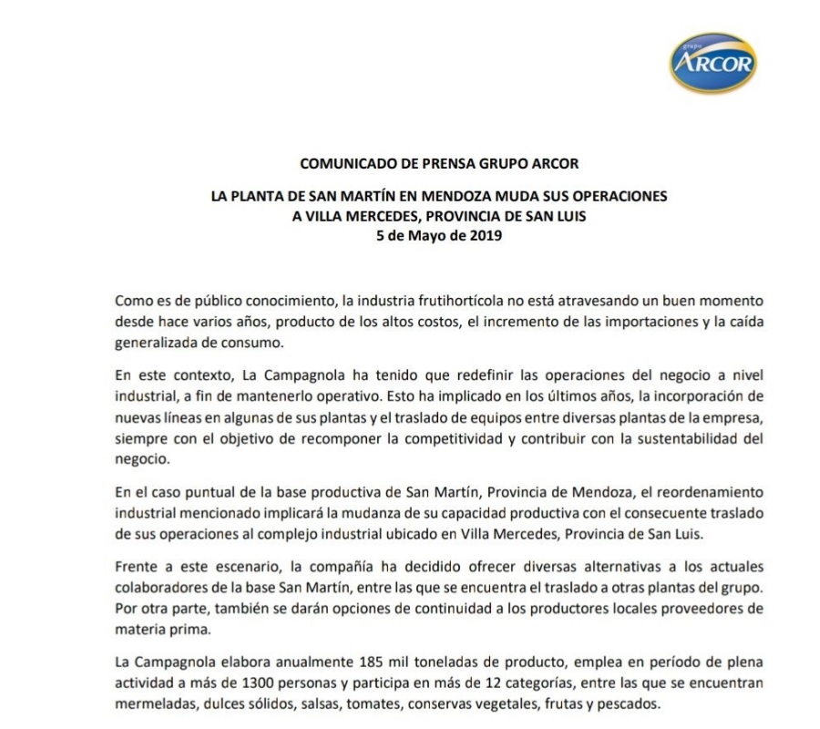 Asimismo, el gremialista afirmó que desde la Campagnola aseguraron que se les pagará el 100% de las indemnizaciones y que también se les ofreció, para aquellos que lo quieran, seguir vinculado a la empresa en otra planta de Arcor que se encuentra en Villa Mercedes Provincia de San Luis.