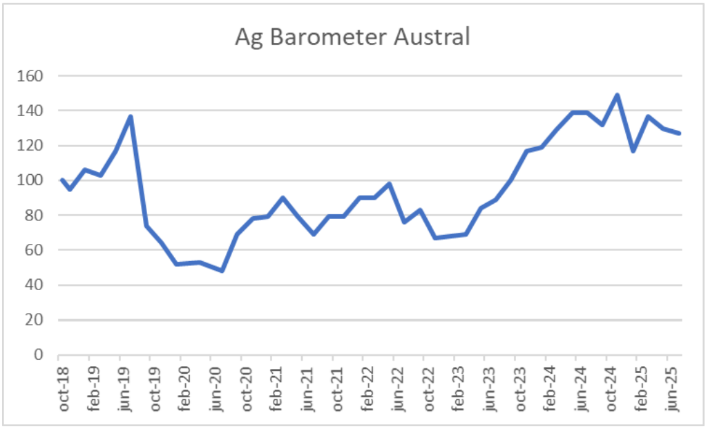 El Ag Barometer Austral de julio-agosto 2025 registró una baja de 1,5% respecto a mayo, descendiendo de 130 a 127 puntos y acumula una caída anual del 15%. Aunque la confianza general se mantiene en terreno positivo, preocupa el fuerte retroceso en las expectativas de inversión en activos fijos, que pasaron de 112 en noviembre de 2024 a 66 en julio 2025, con una caída del 59% en apenas ocho meses.