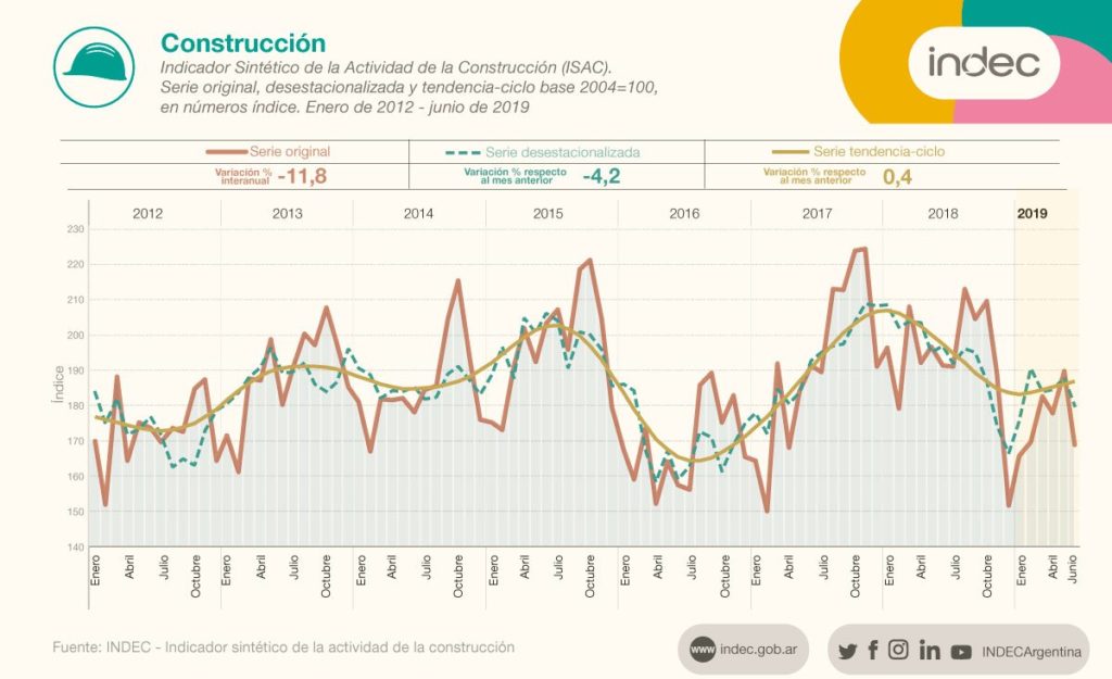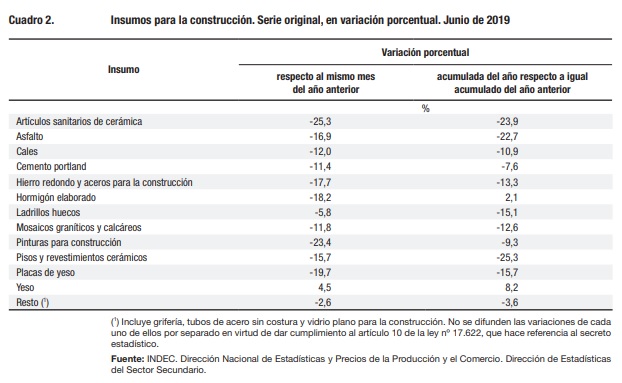 Los datos del consumo aparente de los insumos para la construcción en junio de 2019 muestran, con relación a igual mes del año anterior, bajas de 25,3% en artículos sanitarios de cerámica; 23,4% en pinturas para construcción; 19,7% en placas de yeso; 18,2% en hormigón elaborado; 17,7% en hierro redondo y aceros para la construcción; 16,9% en asfalto; 15,7% en pisos y revestimientos cerámicos; 12,0% en cales; 11,8% en mosaicos graníticos y calcáreos; 11,4% en cemento portland; 5,8% en ladrillos huecos y 2,6% en el resto de los insumos (incluye grifería, tubos de acero sin costura y vidrio para construcción). Mientras tanto, se observa una suba de 4,5% en yeso.