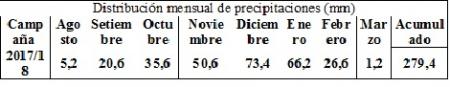 En la tabla 1 muestra la distribución mensual de las precipitaciones, entre agosto 2017 y marzo 2018.