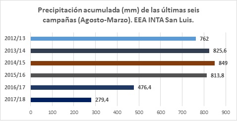 De acuerdo con la Estación Meteorológica de la Estación Experimental Agropecuaria de INTA San Luis ubicada en Villa Mercedes, el promedio histórico del período mencionado, es de 526 milímetros. Es decir casi el doble del registro de la pasada campaña, que fue de 279 milímetros.