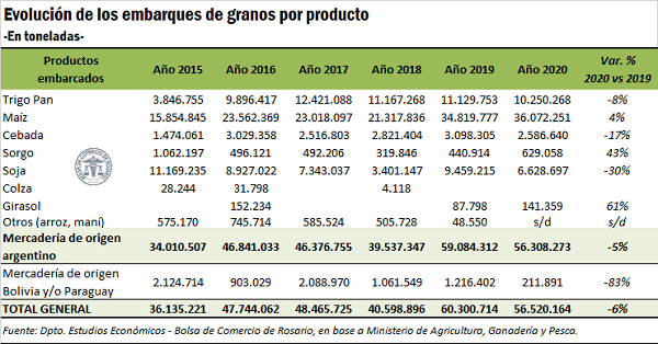 De acuerdo con el último Informe de la Dirección de Informaciones y Estudios Económicos de la Bolsa de Comercio de Rosario (DIYEE), «en 2020 el país embarcó –por todas sus terminales portuarias- granos por más de 56,5 millones de toneladas, un 6% por detrás del récord del 2019 pero, aun así, el segundo mayor volumen de la historia».