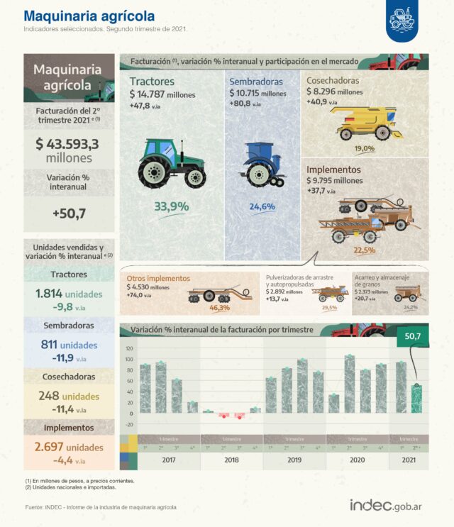 Este jueves el indec informó que la venta de máquinas agrícolas, durante el segundo trimestre de 2021, alcanza una facturación de 43.593,3 millones de pesos, lo que representa un aumento de 50,7% en relación con el mismo trimestre de 2020.