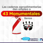 Según este informe, las cadenas agro generan 1 de cada 6 empleos privados, directos e indirectos, lo cual equivale al 17% del total de empleo nacional privado. Lo que visualmente se traduce en que “el campo genera empleo para 43 monumentales llenos”. Si hacemos foco en nuevos puestos creados, fueron 94.130 empleos en 2017, equivalente a que el agro hubiera generado empleos para todo Gualeguaychú.