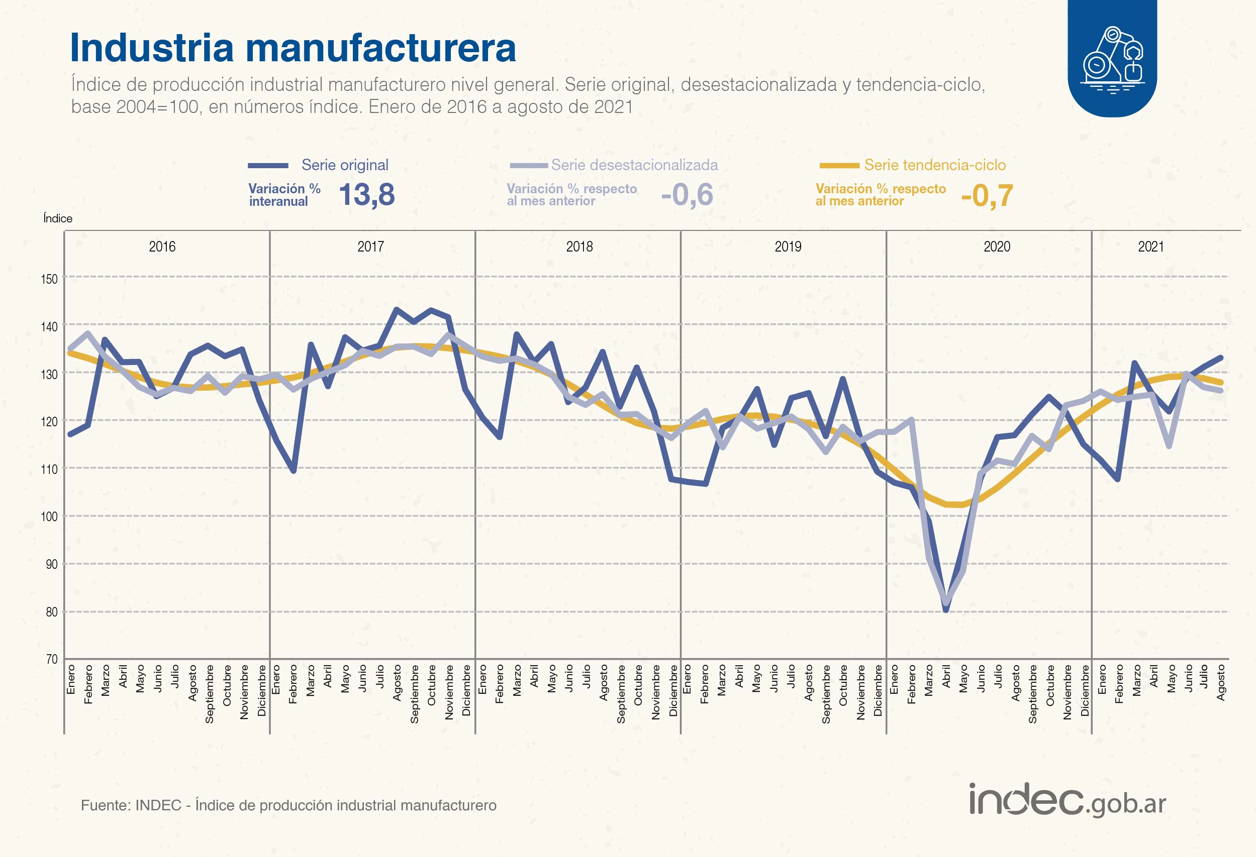 El Indec publicó el informe del Índice de Producción Industrial (IPI) manufacturero de agosto. La variación interanual sigue mostrando números apabullantes, aunque lo cierto es que compara contra el piso histórico que marcó lo peor de la pandemia. Hubo un crecimiento de 13,8% contra agosto del 2020. Pero también hubo una mejora de 5,8% respecto al mismo mes del 2019, sobre el cierre de período Cambiemos.