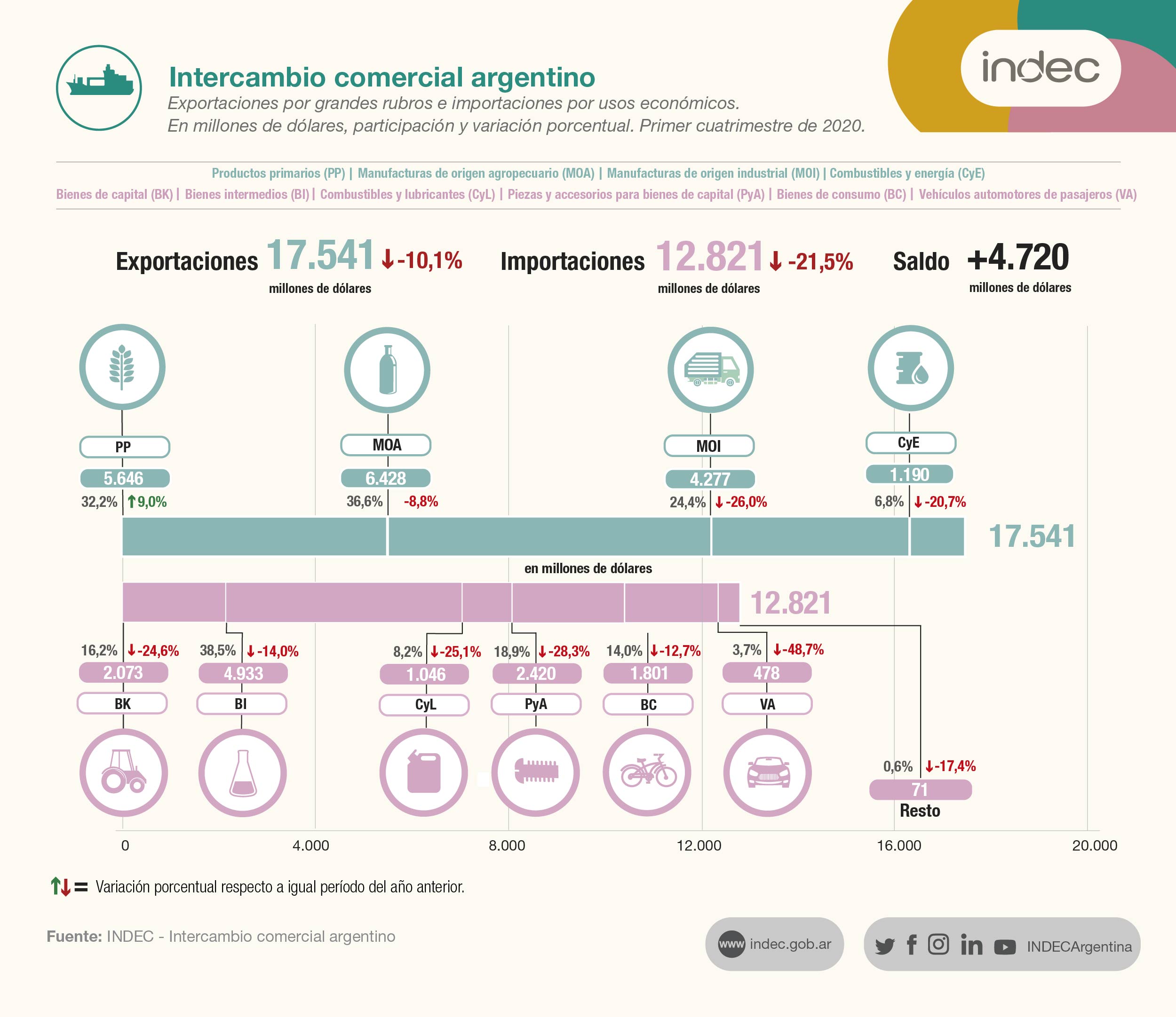 Las que más sufrieron fueron las industriales. El Indec reseñó: «Las exportaciones en abril disminuyeron en USD1.008 millones respecto a igual mes de 2019 debido a la caída en cantidades de 13% y en precios de 6,7%. En términos desestacionalizados con relación a marzo de 2020, se redujeron 5,9%. La de manufacturas de origen industrial (MOI), combustibles y energía (CyE) y manufacturas de origen agropecuario (MOA) descendieron de manera interanual 58,3%, 33,9% y 2,7%, respectivamente; mientras que las de productos primarios (PP) aumentaron 10,8%».