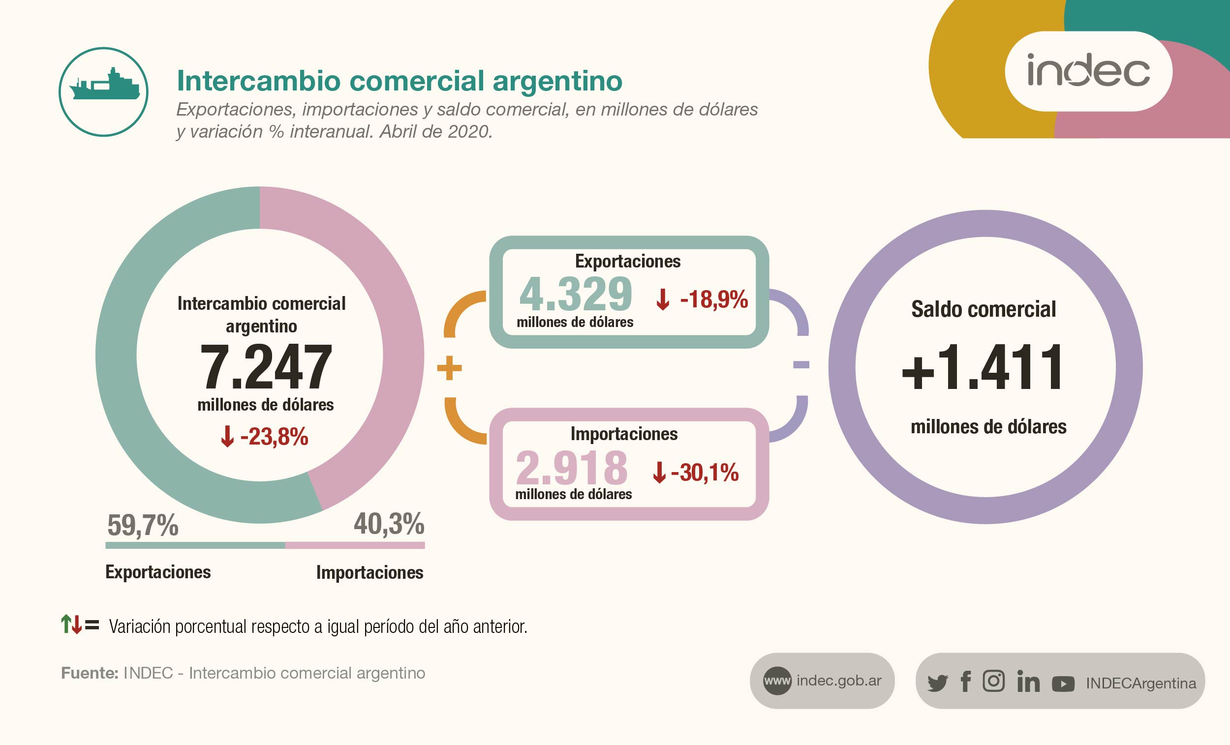 Las exportaciones también cayeron con fuerza durante abril, de la mano del carácter global de las cuarentenas. Registraron una contracción de 18,9% respecto al mismo mes del año pasado. Y de hecho, las ventas externas a dos de los tres principales socios comerciales del país sufrieron un derrumbe extraordinario: las destinadas a Brasil, que hasta el cierre del 2019 fue el principal socio comercial histórico, cayeron 57,3% y a Estados Unidos, que ostenta el tercer puesto, 25,3%. De esa forma, China desplazó del primer lugar al país vecino, tras un crecimiento interanual de 50,6%.