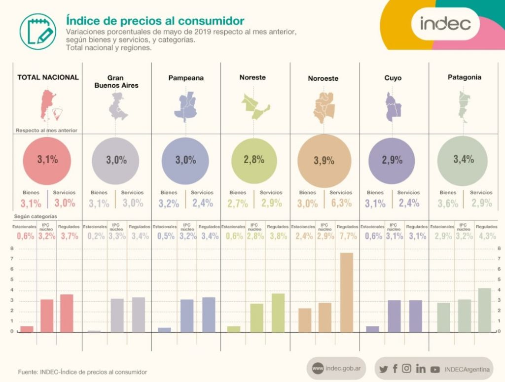 La inflación del 3,1 por ciento de mayo, frente a abril, implica una baja en relación a los meses previos, pero todavía está muy por encima del valor mensual que tenía antes de la devaluación del año pasado e incluso de la situación que heredó la actual administración a fines de 2015. En los últimos doce meses, la suba de precios es del 57,3 por ciento, lo cual implica un nuevo récord desde la inflación de 1991. En alimentos y bebidas, los precios acumulan una suba anual del 65 por ciento.
