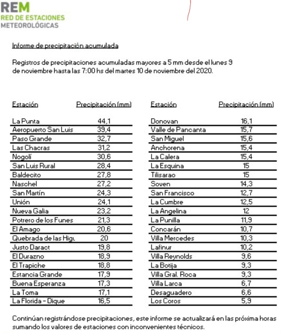En los registros de la Red de Estaciones Meteorológicas de San Luis se puede observar que en casi todas las localidades y parajes hubo precipitaciones. Aún en los lugares más desérticos, como la zona noroeste, se midieron milímetros de lluvia.