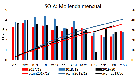 El registro del mes es el mayor desde el 2016 cuando se había alcanzado en dicho periodo un procesamiento de 3,2 M de ton, año que fue récord histórico de volumen de soja industrializado por un total de 44,4 M de ton.