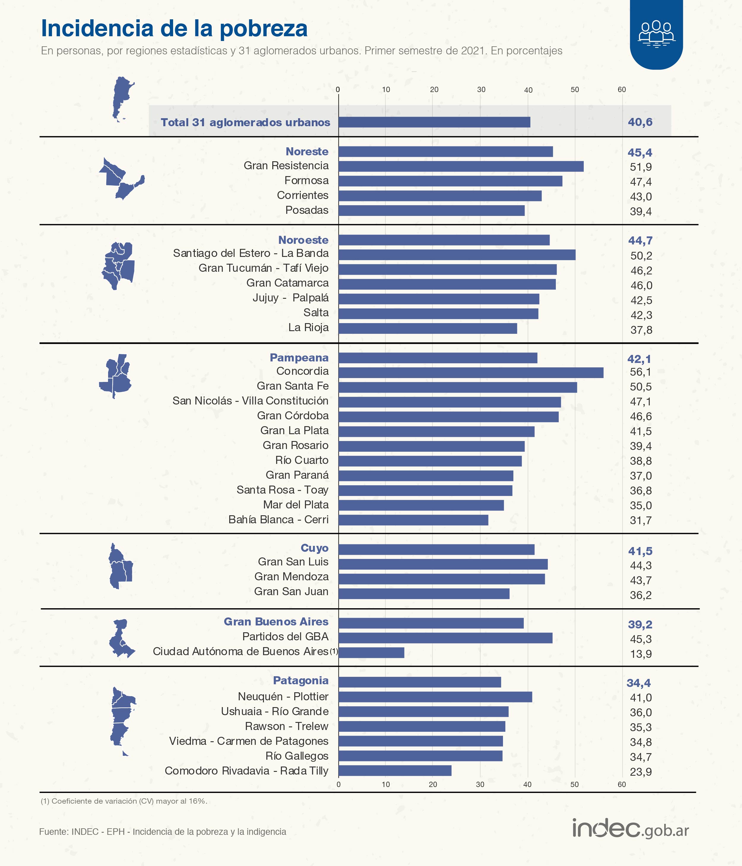Por último, las mayores incidencias de la pobreza en personas se observaron en las regiones Noreste (NEA), 45,4%; y Noroeste (NOA), 44,7%. Las menores, por su parte, se registraron en las regiones Patagonia, 34,4%; y GBA, 39,2%.