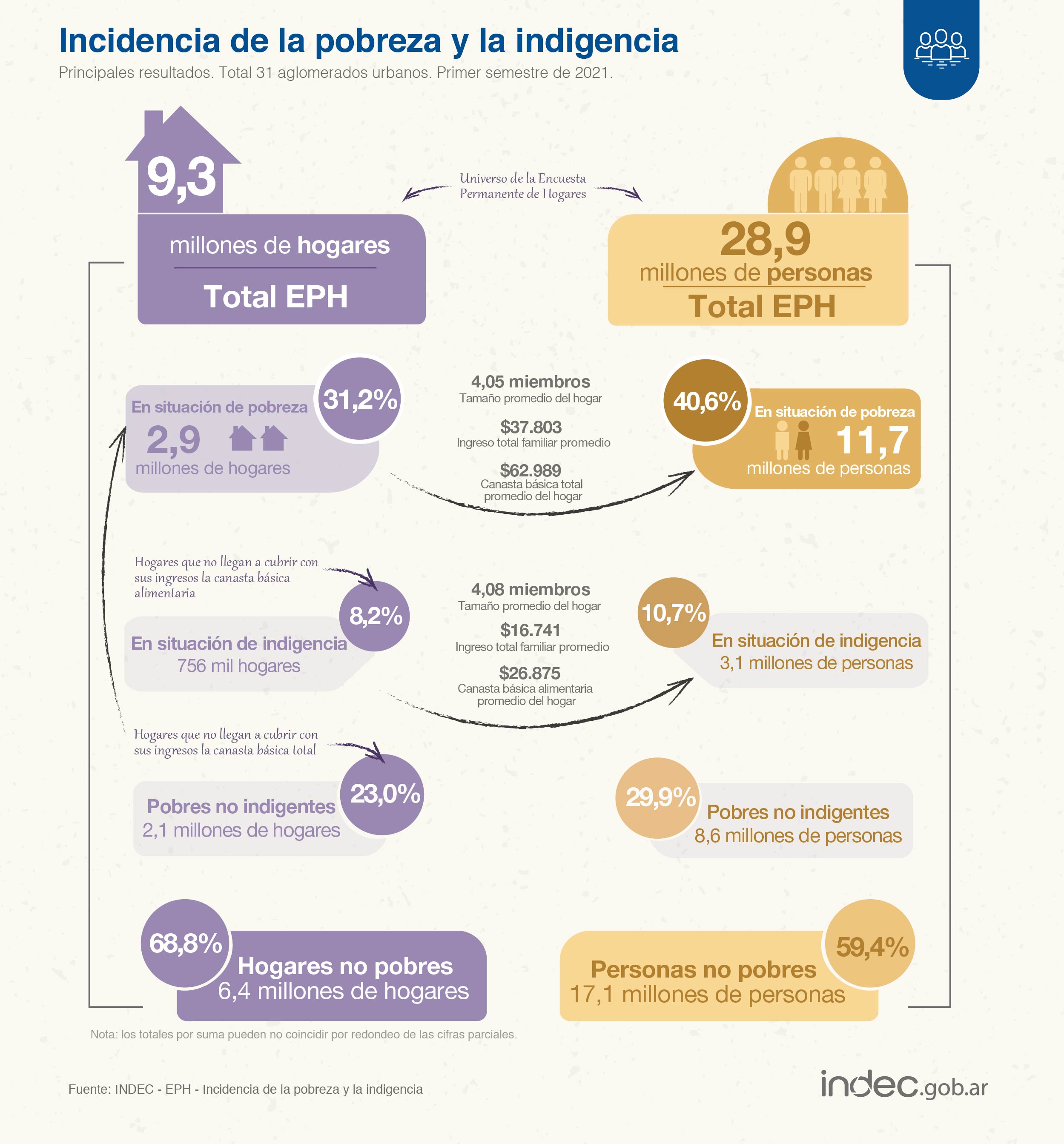 Según el informe difundido este jueves por el Instituto Nacional de Estadística y Censos (Indec), el índice de pobreza alcanzó al 40,6% de la población en el primer semestre del año, lo que representó una baja de 1,4 puntos porcentuales (p. p.) respecto al 42% que hubo último semestre de 2020,