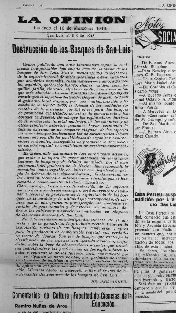 Un artículo publicado en La Opinión el 9 de abril de 1948 advertía sobre la pérdida masiva del monte nativo en San Luis. En aquel entonces, más de 1,5 millones de hectáreas ya habían sido devastadas por la tala indiscriminada. El texto reclamaba una ley de protección forestal y alertaba sobre la desaparición de una de las principales fuentes de riqueza provincial.