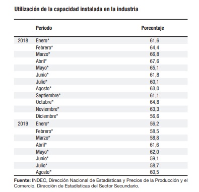 Cabe destacar, que la industria automotriz registró en agosto pasado un nivel de utilización de la capacidad instalada inferior al de igual mes del año anterior, originado en la menor cantidad de unidades fabricadas por las terminales por la caída de la demanda y stock acumulados, que arrastró también al sector de la metalmecánica, que la abastece de los principales insumos.