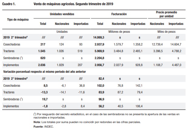 La venta de máquinas agrícolas durante el segundo trimestre de 2019 alcanzó una facturación de 14.069,3 millones de pesos, que representa un aumento de 82,4% en relación con el mismo trimestre de 2018.