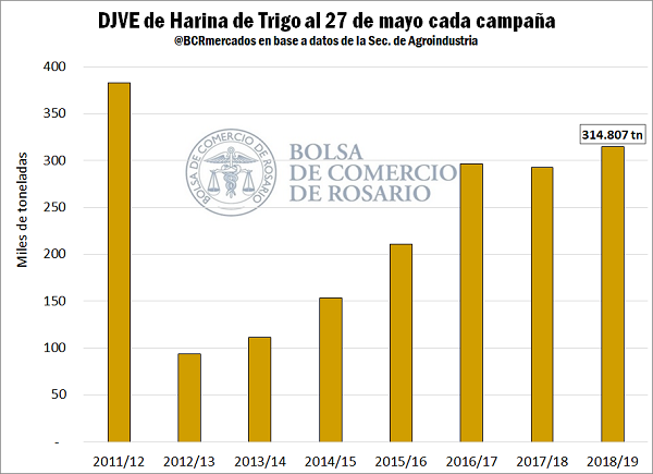 Las Declaraciones Juradas de Ventas al Exterior de harina de trigo a la semana actual totalizan poco menos de 315.000 toneladas, el volumen más alto registrado para las últimas 7 campañas. Las ventas externas de la industria molinera argentina a fines de mayo evidencian un sostenido aumento desde la campaña 2013/14, creciendo a una tasa promedio anual del 23%.