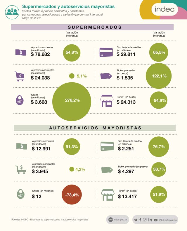 Las ventas en los supermercados aumentaron durante mayo 5,1% en relación a igual mes del año pasado, con un fuerte incremento en el canal de internet respecto a doce meses atrás a causa de las medidas de aislamiento social por el coronavirus, informó el Instituto Nacional de Estadística y Censos (Indec).