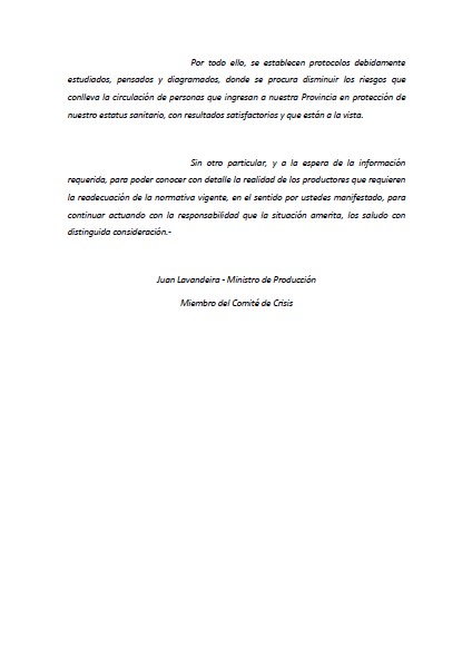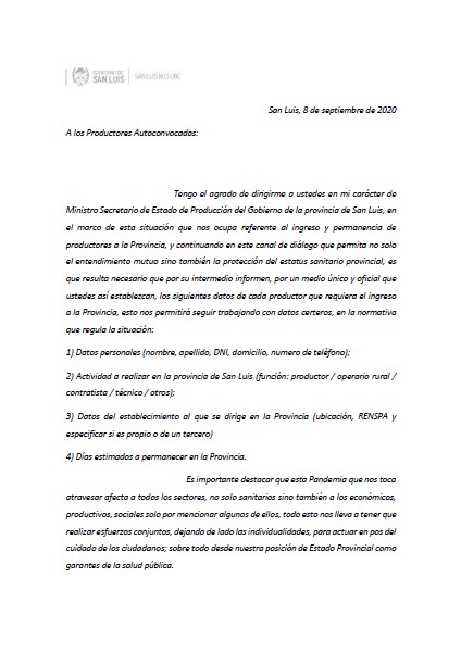 En una carta enviada por el ministro de Producción de San Luis, Juan Lavandeira, a los productores autoconvocados de la provincia de Córdoba les solicita que le remitan por “un medio único y oficial” datos de cada productor que requiera su ingreso en la provincia.