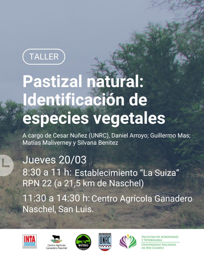 Con recorridas por lotes con variada flora nativa, el jueves 20 de marzo próximo se desarrollará el segundo taller «Pastizal natural: identificación de especies vegetales». El encuentro se desarrollará en dos etapas. La Primera será de 8:30 a 11 en Estancia La Suiza, ubicada entre Naschel y Villa del Carmen, mientras que la segunda se realizará de 11:30 a 14:30 en el Centro Agrícola Ganadero de Naschel.