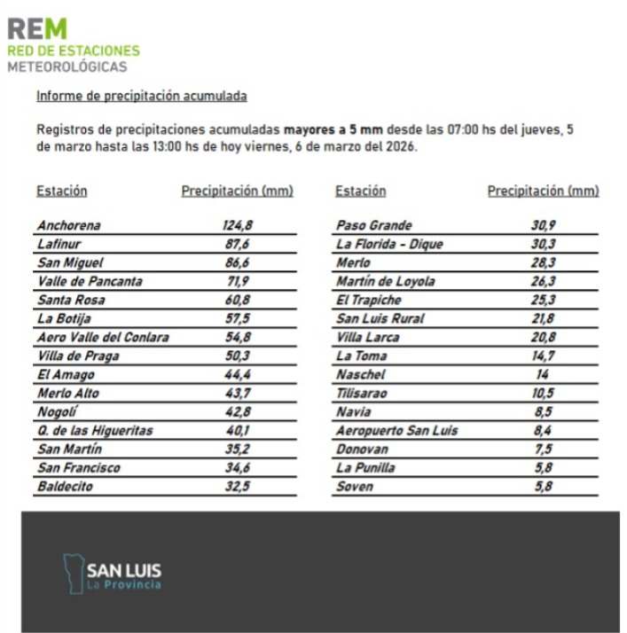 Un importante evento de precipitaciones se registró en distintas zonas de la provincia de San Luis entre la mañana del jueves 5 y el mediodía del viernes 6 de marzo de 2026, según el informe difundido por la Red de Estaciones Meteorológicas (REM) provincial.