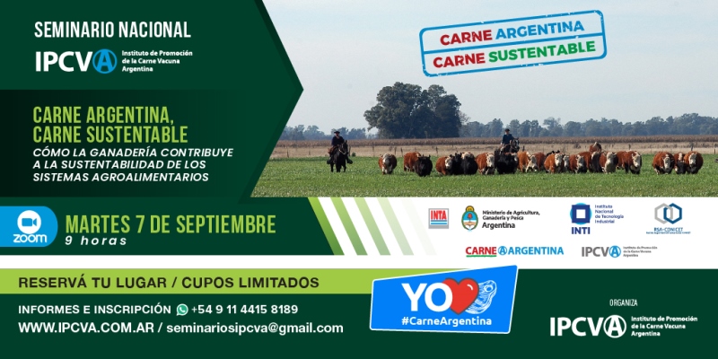 El martes 7 de septiembre a las 9 horas, de manera virtual, se llevará adelante el seminario nacional “Carne argentina, carne sustentable”, organizado por el Instituto de Promoción de la Carne Vacuna Argentina (IPCVA) con la participación de especialistas del INTA, el Conicet, el INTI, entre otros.