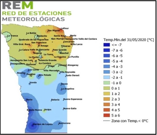 El reporte de la Red de Estaciones Meteorológicas (REM) de San Luis indica que la localidad más fría del día fue Martín de Loyola con -6.2°. En orden de temperaturas bajas le siguieron Bajada Nueva, -5.9°; Navia, -4.7° Todos estos lugares pertenecen al sur de la provincia. Similares mínimas tuvieron Nueva Galia, Buena Esperanza y La Angelina.