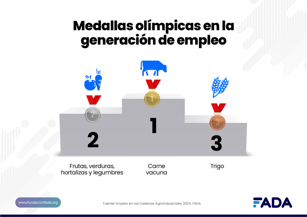 El segundo puesto con la plateada es para la cadena de frutas, verduras, hortalizas y legumbres con el 10,4% del trabajo agro y el bronce se lo lleva el trigo con el 10,1% del empleo.