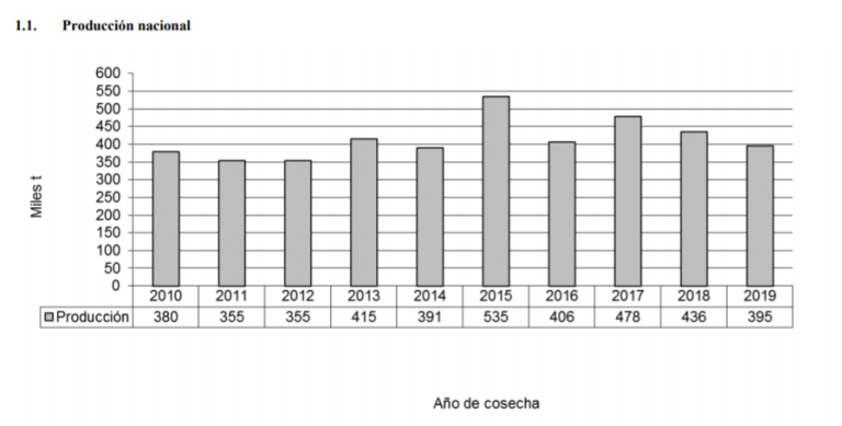 Situada en los valores de la última década la campaña actual aparece dentro de los promedios históricos, que tuvieron su pico más alto en el año 2015. Sin embargo, los volúmenes producidos por el sector atraviesan su segundo año de caídas consecutivas desde 2017.