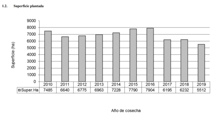 Otro dato importante del documento es la reducción del área total sembrada (que abarca las provincias de Mendoza, San Juan, Río Negro, La Rioja y la región del NOA) que pasó de 6.232 a 5.512 hectáreas en el último año y continúa con una tendencia a la baja desde el 2016 -a excepción de 2018 donde los valores se mantuvieron relativamente estables-. El total del área sembrada actualmente es el más bajo de los últimos diez años.