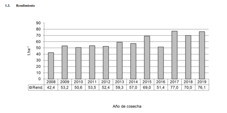 Lo que sí creció en 2019 fueron los rendimientos productivos: a nivel país se alcanzaron las 76 toneladas por hectárea; un 8% más que las 70 toneladas por hectárea del 2018 y muy cerca de los valores máximos alcanzados en el año 2017, con 77 toneladas por hectárea. Esto significa que a pesar de reducirse el área sembrada, hubo un aumento de productividad por hectárea.