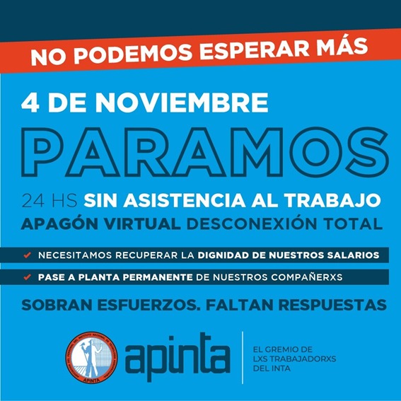 A fines de septiembre se conoció el acuerdo de la paritaria nacional para la administración pública, con un irrisorio 7% de aumento a partir de octubre. Este porcentaje, además de generar mucha disconformidad en todos los trabajadores del INTA, provocó la reacción del secretariado nacional de APINTA que inmediatamente convocó a un Congreso Extraordinario para mediados de octubre, donde se decidió el paro de actividades que ahora se concreta.