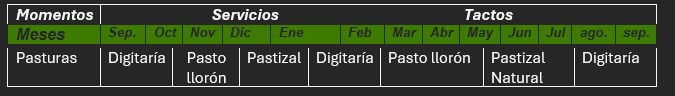 Enero (desde el 10 aprox.): Se hace uso de Digitaria eriantha, que en ese momento presenta su pico de calidad, superando al pasto llorón, que no cubre los requerimientos proteicos debido al estrés térmico.
