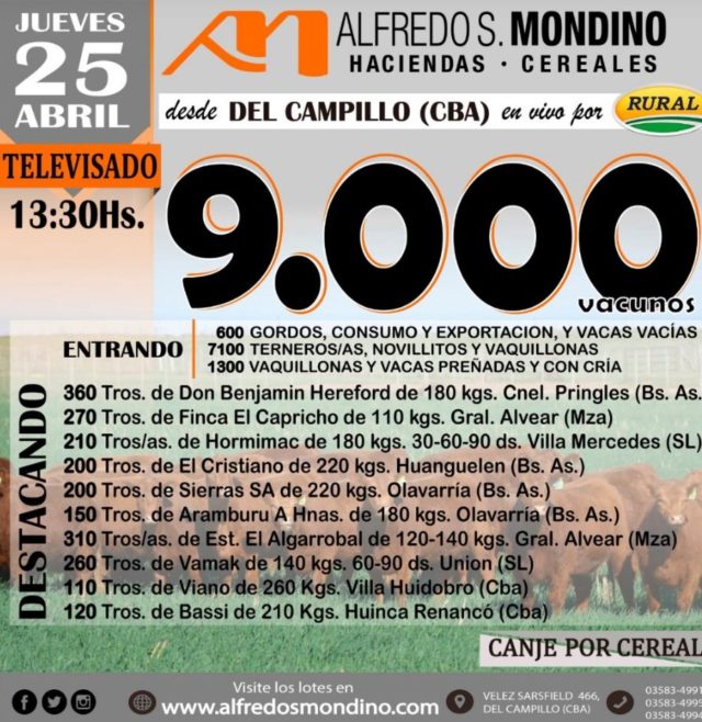 En una nueva edición de remate televisado por Canal Rural Alfredo Mondino rematará mañana jueves 25 en la localidad cordobesa de Del Campillo la cantidad de 9 mil vacunos.
