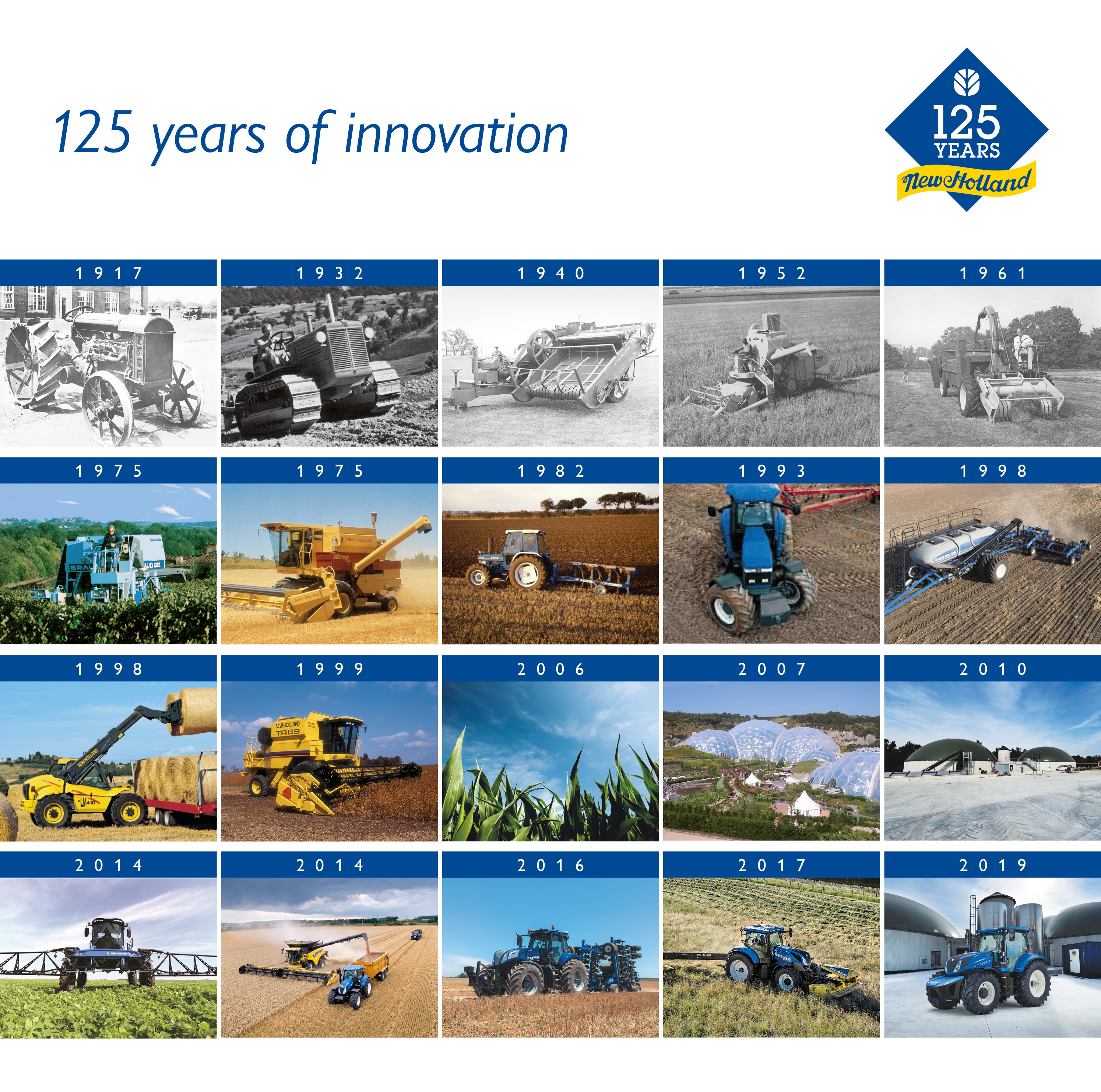 Los valores y la visión de los fundadores de New Holland constituyen el núcleo central de la marca hasta la fecha, celebrando 125 años al lado de los agricultores, brindándoles el apoyo necesario en todo momento con una inversión e innovación constantes para poder disponer de productos, tecnologías y servicios para trabajar de una manera eficiente, sostenible y rentable.