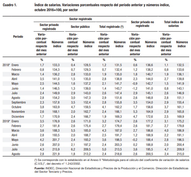 En la comparación con julio, el salario registró en general una suba de 2,4% en agosto. Eso estuvo muy por debajo de la inflación de 4% que se observó durante ese mes. Así, en términos reales, cayó 1,5%. La economista de LCG, Julia Segoviano, destacó que se trató de «el mayor retroceso del año en el poder adquisitivo». La variación interanual fue de 42,4%, también muy por debajo del 54,5% de los precios al consumidor.